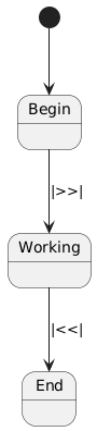 The $Begin state utilizes the “start system” message >> symbol to kick things into gear and then transitions to the $Working state to go do stuff.